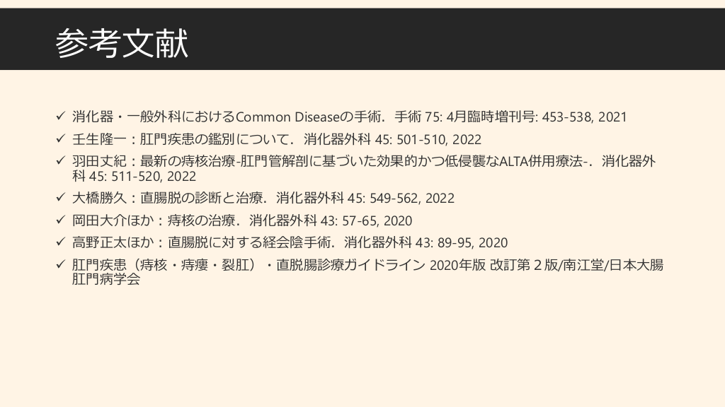 #12. 参考文献 ✓ 消化器・一般外科におけるCommon Diseaseの手術.手術 75: 4月臨時増刊号: 453-538, 2021 ✓ 壬生隆一:肛門疾患の鑑別について.消化器外科 45: 501-510, 2022 ✓ 羽田丈紀:最新の痔核治療-肛門管解剖に基づいた効果的かつ低侵襲なALTA併用療法-.消化器外 科 45: 511-520, 2022 ✓ 大橋勝久:直腸脱の診断と治療.消化器外科 45: 549-562, 2022 ✓ 岡田大介ほか:痔核の治療.消化器外科 43: 57-65, 2020 ✓ 高野正太ほか:直腸脱に対する経会陰手術.消化器外科 43: 89-95, 2020 ✓ 肛門疾患(痔核・痔瘻・裂肛)・直脱腸診療ガイドライン 2020年版 改訂第2版/南江堂/日本大腸 肛門病学会