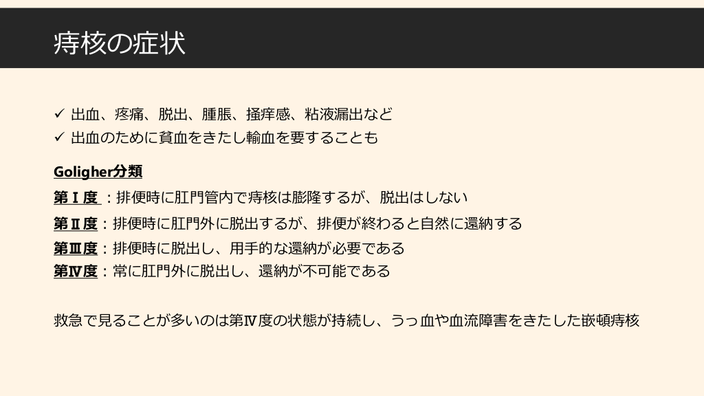#4. 痔核の症状 ✓ 出血、疼痛、脱出、腫脹、掻痒感、粘液漏出など ✓ 出血のために貧血をきたし輸血を要することも Goligher分類 第Ⅰ度 :排便時に肛門管内で痔核は膨隆するが、脱出はしない 第Ⅱ度:排便時に肛門外に脱出するが、排便が終わると自然に還納する 第Ⅲ度:排便時に脱出し、用手的な還納が必要である 第Ⅳ度:常に肛門外に脱出し、還納が不可能である 救急で見ることが多いのは第Ⅳ度の状態が持続し、うっ血や血流障害をきたした嵌頓痔核