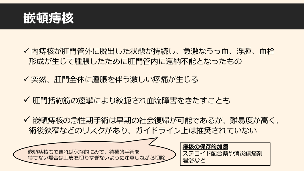 #5. 嵌頓痔核 ✓ 内痔核が肛門管外に脱出した状態が持続し、急激なうっ血、浮腫、血栓 形成が生じて腫脹したために肛門管内に還納不能となったもの ✓ 突然、肛門全体に腫脹を伴う激しい疼痛が生じる ✓ 肛門括約筋の痙攣により絞扼され血流障害をきたすことも ✓ 嵌頓痔核の急性期手術は早期の社会復帰が可能であるが、難易度が高く、 術後狭窄などのリスクがあり、ガイドライン上は推奨されていない 嵌頓痔核もできれば保存的にみて、待機的手術を 待てない場合は上皮を切りすぎないように注意しながら切除 痔核の保存的加療 ステロイド配合薬や消炎鎮痛剤 温浴など