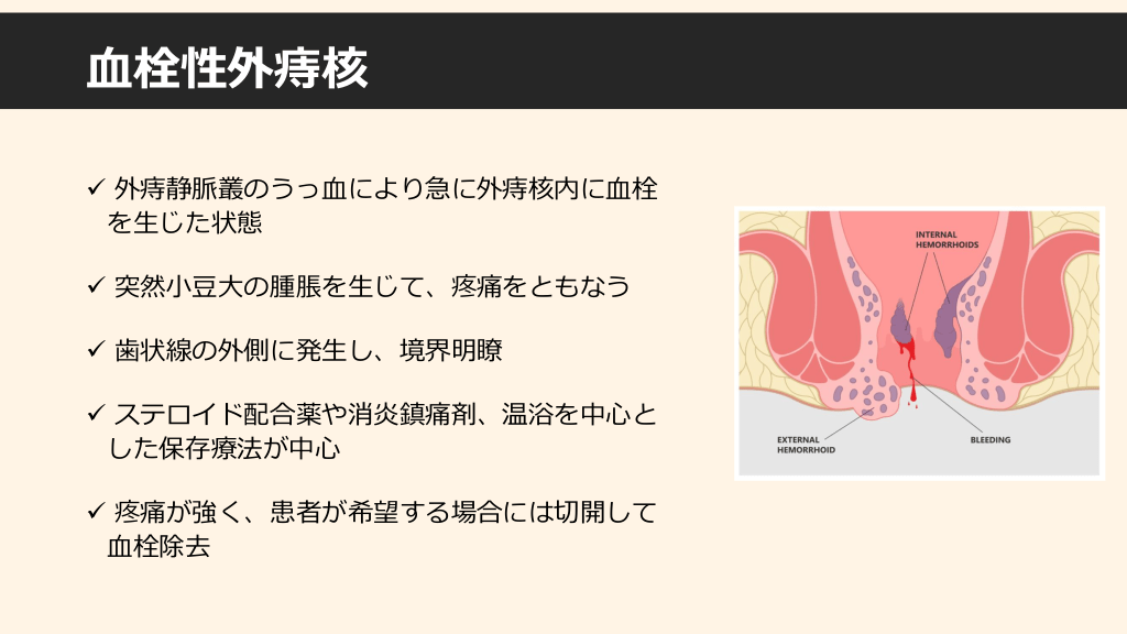 #6. 血栓性外痔核 ✓ 外痔静脈叢のうっ血により急に外痔核内に血栓 を生じた状態 ✓ 突然小豆大の腫脹を生じて、疼痛をともなう ✓ 歯状線の外側に発生し、境界明瞭 ✓ ステロイド配合薬や消炎鎮痛剤、温浴を中心と した保存療法が中心 ✓ 疼痛が強く、患者が希望する場合には切開して 血栓除去