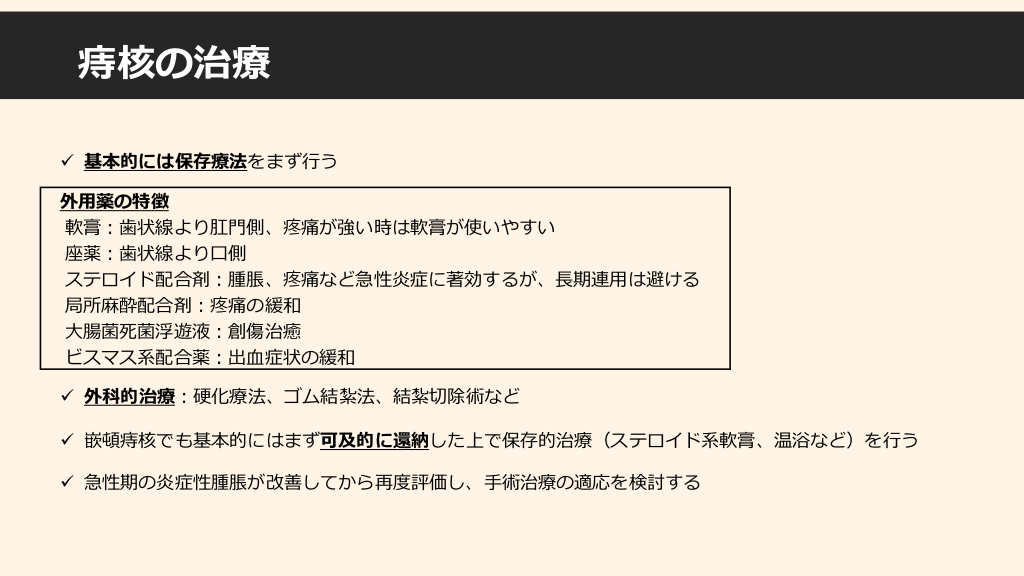 #7. 痔核の治療 ✓ 基本的には保存療法をまず行う 外用薬の特徴 軟膏:歯状線より肛門側、疼痛が強い時は軟膏が使いやすい 座薬:歯状線より口側 ステロイド配合剤:腫脹、疼痛など急性炎症に著効するが、長期連用は避ける 局所麻酔配合剤:疼痛の緩和 大腸菌死菌浮遊液:創傷治癒 ビスマス系配合薬:出血症状の緩和 ✓ 外科的治療:硬化療法、ゴム結紮法、結紮切除術など ✓ 嵌頓痔核でも基本的にはまず可及的に還納した上で保存的治療(ステロイド系軟膏、温浴など)を行う ✓ 急性期の炎症性腫脹が改善してから再度評価し、手術治療の適応を検討する