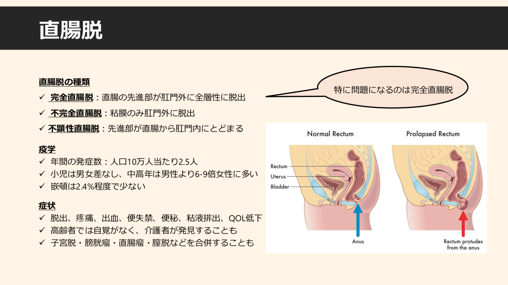 #8. 直腸脱 直腸脱の種類 ✓ 完全直腸脱:直腸の先進部が肛門外に全層性に脱出 ✓ 不完全直腸脱:粘膜のみ肛門外に脱出 ✓ 不顕性直腸脱:先進部が直腸から肛門内にとどまる 疫学 ✓ 年間の発症数:人口10万人当たり2.5人 ✓ 小児は男女差なし、中高年は男性より6-9倍女性に多い ✓ 嵌頓は2.4%程度で少ない 症状 ✓ 脱出、疼痛、出血、便失禁、便秘、粘液排出、QOL低下 ✓ 高齢者では自覚がなく、介護者が発見することも ✓ 子宮脱・膀胱瘤・直腸瘤・膣脱などを合併することも 特に問題になるのは完全直腸脱