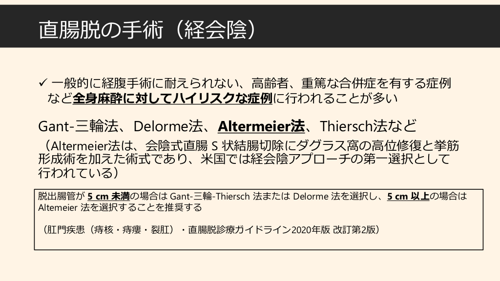#9. 直腸脱の手術(経会陰) ✓ 一般的に経腹手術に耐えられない、高齢者、重篤な合併症を有する症例 など全身麻酔に対してハイリスクな症例に行われることが多い Gant-三輪法、Delorme法、Altermeier法、Thiersch法など (Altermeier法は、会陰式直腸 S 状結腸切除にダグラス窩の高位修復と挙筋 形成術を加えた術式であり、米国では経会陰アプローチの第一選択として 行われている) 脱出腸管が 5 cm 未満の場合は Gant-三輪-Thiersch 法または Delorme 法を選択し、5 cm 以上の場合は Altemeier 法を選択することを推奨する (肛門疾患(痔核・痔瘻・裂肛)・直腸脱診療ガイドライン2020年版 改訂第2版)