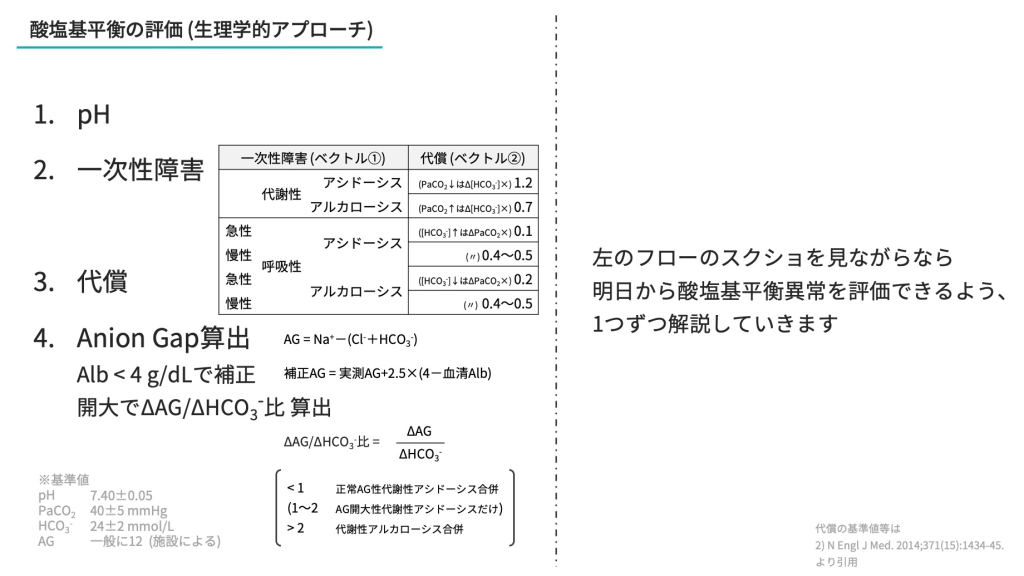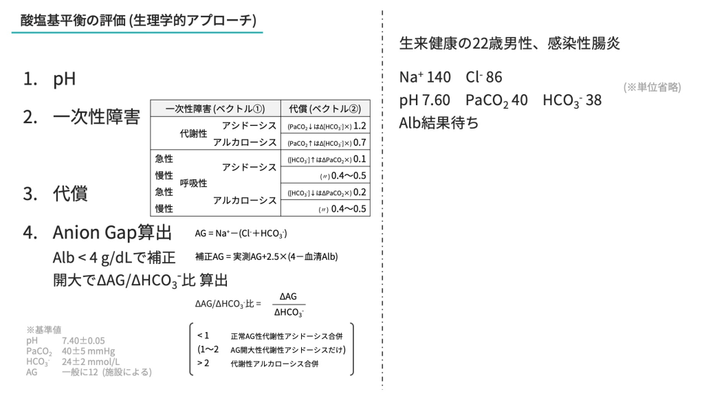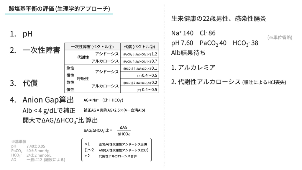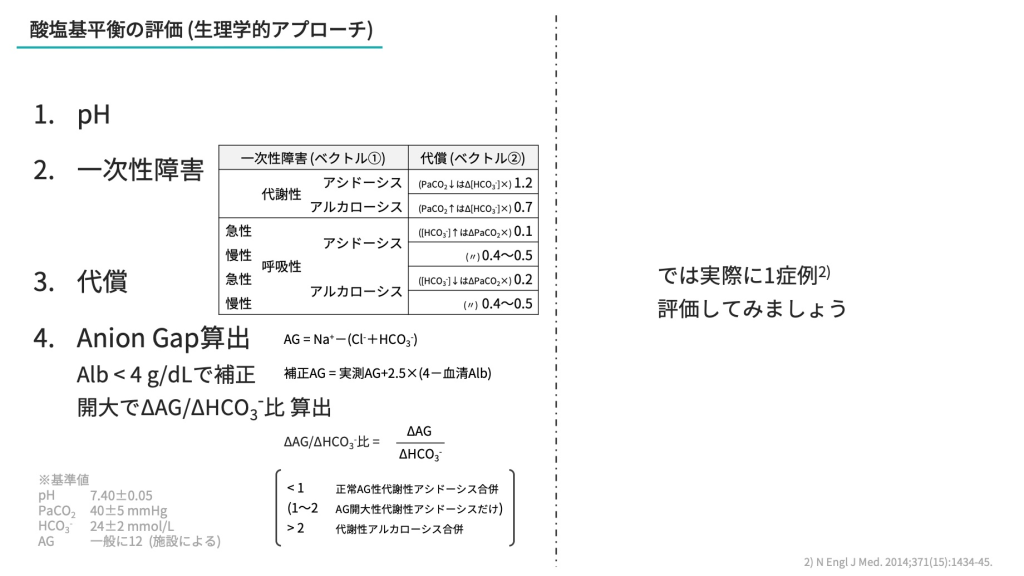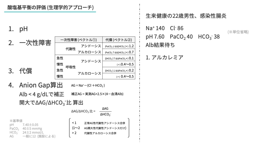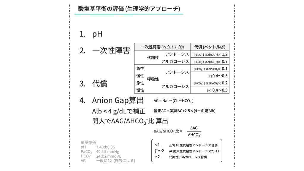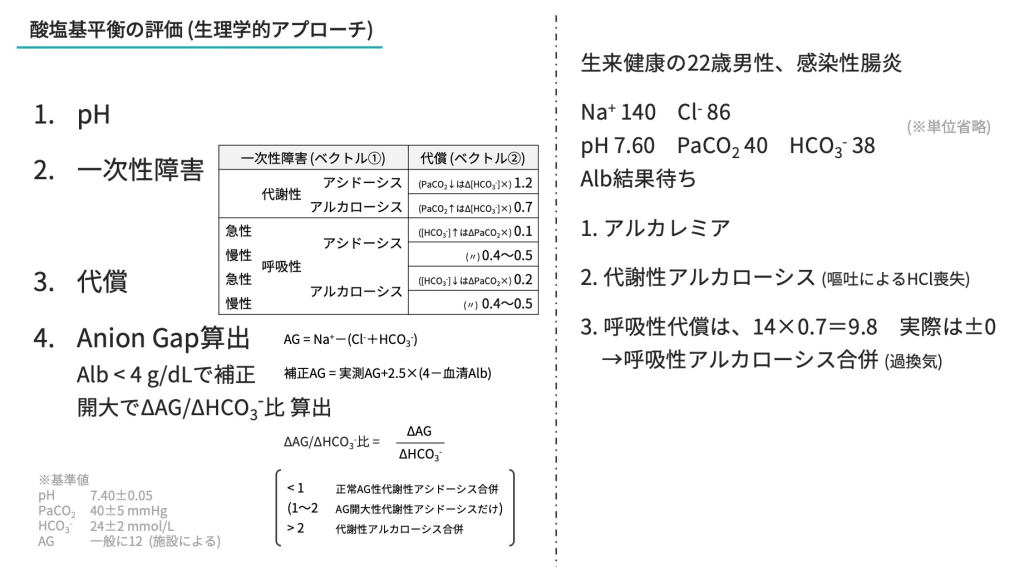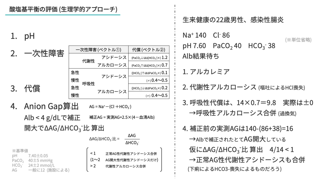学生時代に酸塩基平衡の複雑な話は学んでも、実際の検査値から (合併している酸塩基平衡異常を含め) 評価する術は実地で学ぶしかないことが多いのではないでしょうか。