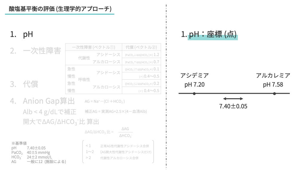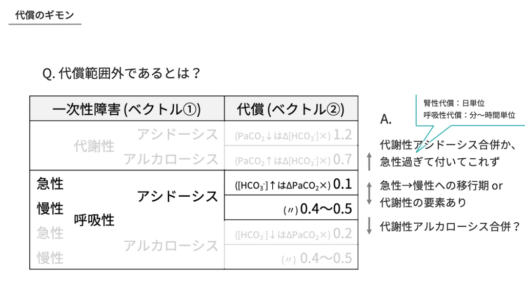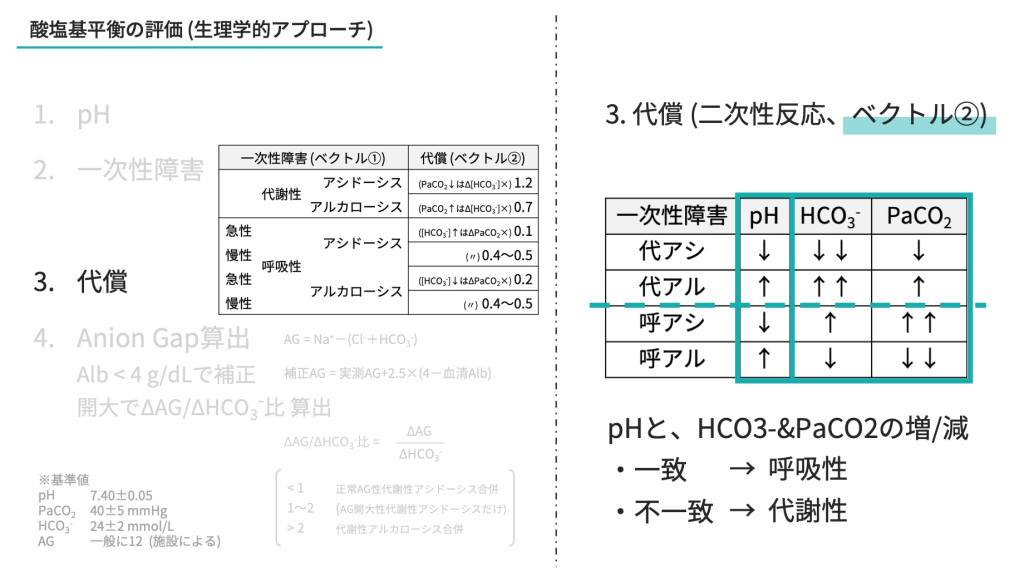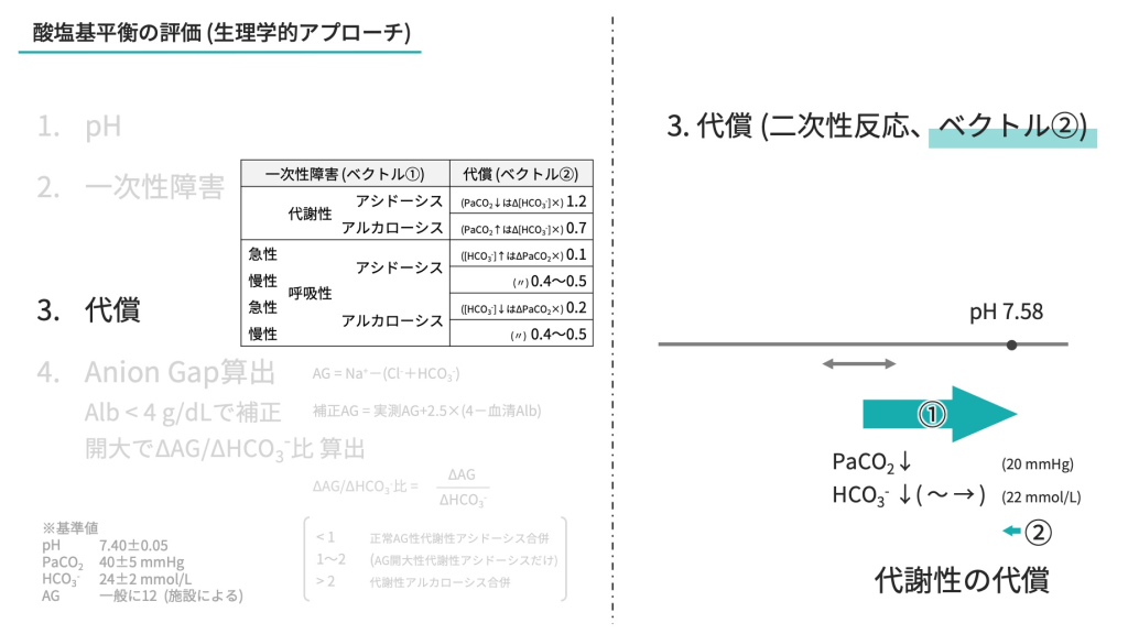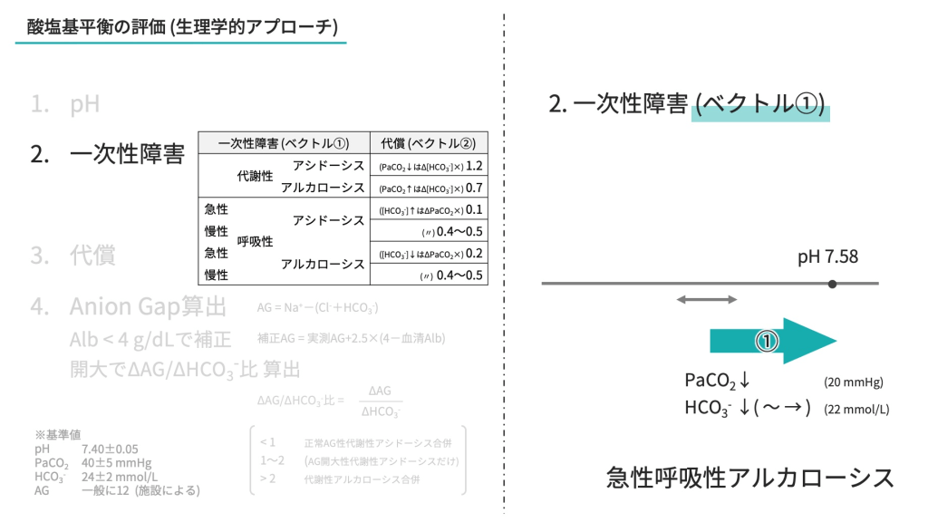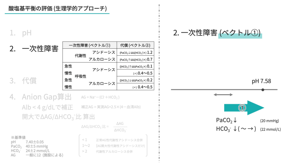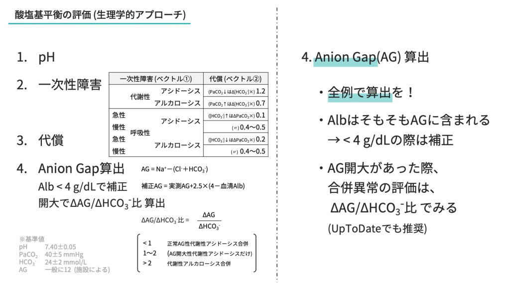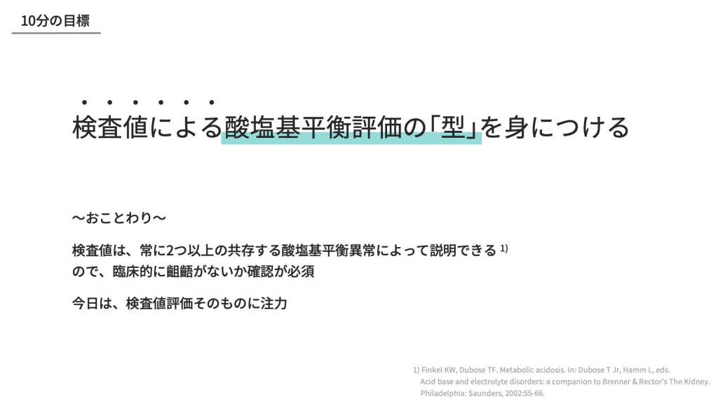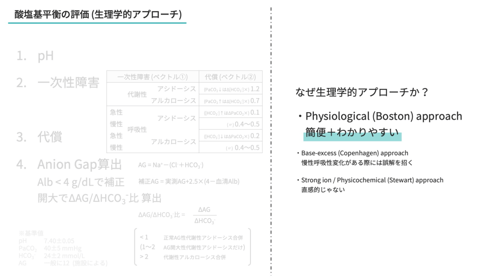 学生時代に酸塩基平衡の複雑な話は学んでも、実際の検査値から (合併している酸塩基平衡異常を含め) 評価する術は実地で学ぶしかないことが多いのではないでしょうか。