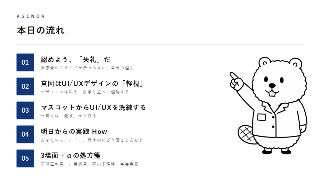 #3. AGENDA 本日の流れ 01 認めよう、「失礼」だ 医療者のスライドが伝わらない、本当の理由 02 真因はUI/UXデザインの「軽視」 デザインの体系を、医学と並べて理解する 03 マスコットからUI/UXを洗練する 一貫性は「起点」から作る 04 明日からの実践 How あなたのスライドに、具体的にどう落とし込むか 05 3場面+αの処方箋 研修医教育・市民講演・院内多職種・学会発表