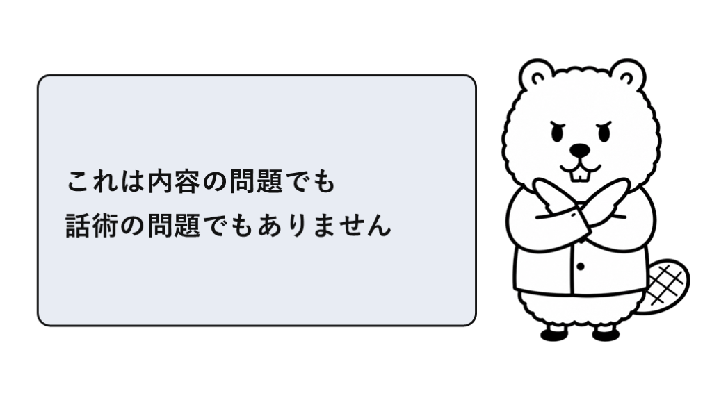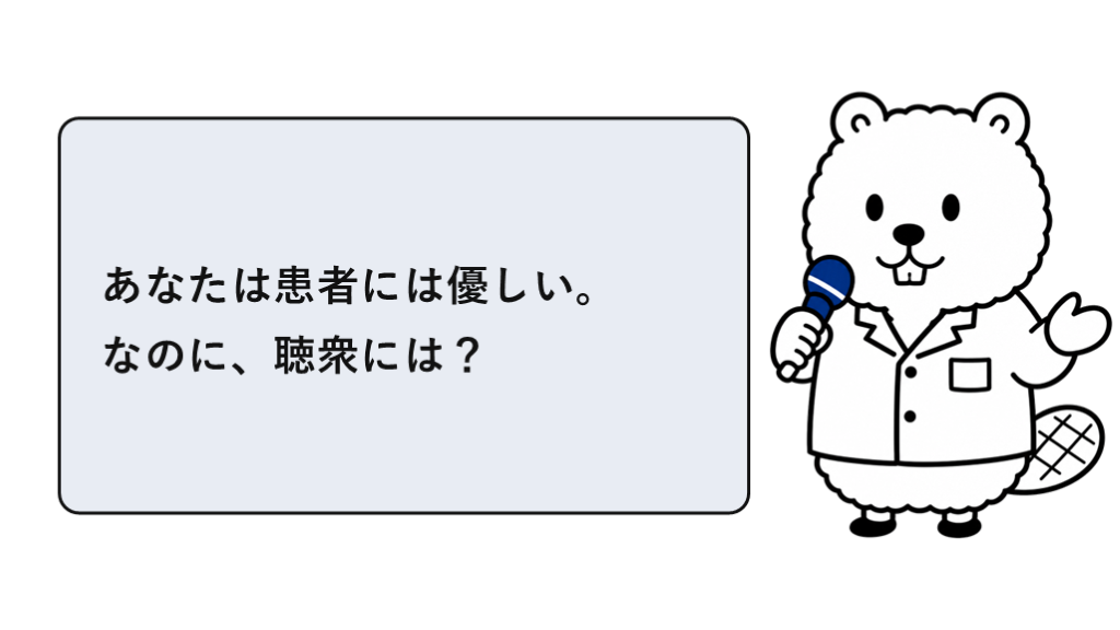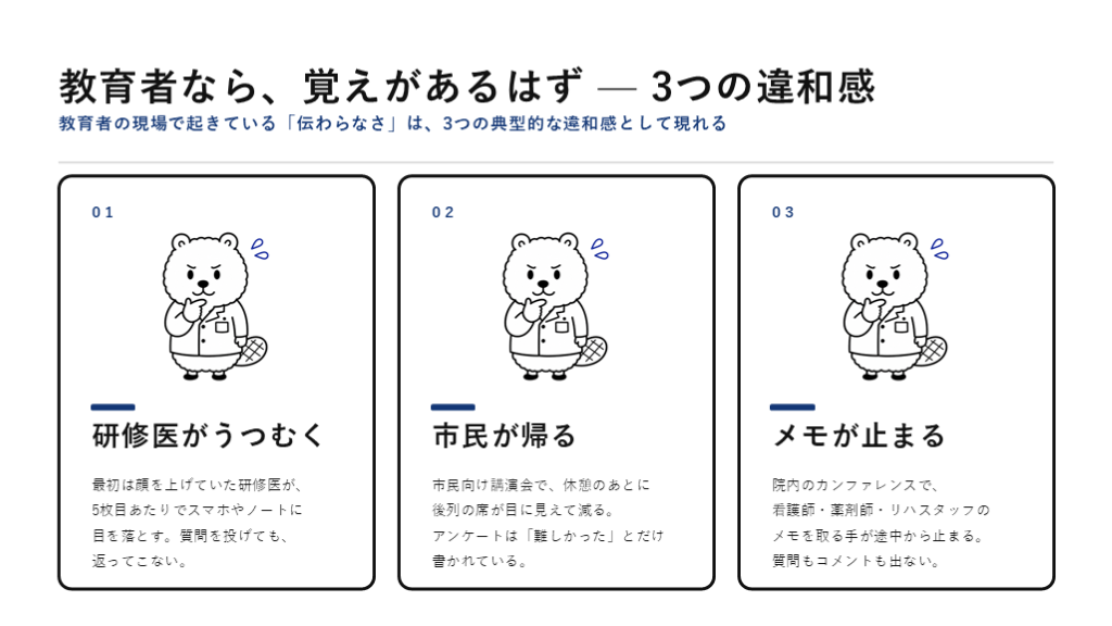 #5. 教育者なら、覚えがあるはず — 3つの違和感 教育者の現場で起きている「伝わらなさ」は、3つの典型的な違和感として現れる 01 研修医がうつむく 最初は顔を上げていた研修医が、5枚目あたりでスマホやノートに目を落とす。質問を投げても、返ってこない。 02 市民が帰る 市民向け講演会で、休憩のあとに後列の席が目に見えて減る。アンケートは「難しかった」とだけ書かれている。 03 メモが止まる 院内のカンファレンスで、看護師・薬剤師・リハスタッフのメモを取る手が途中から止まる。質問もコメントも出ない。