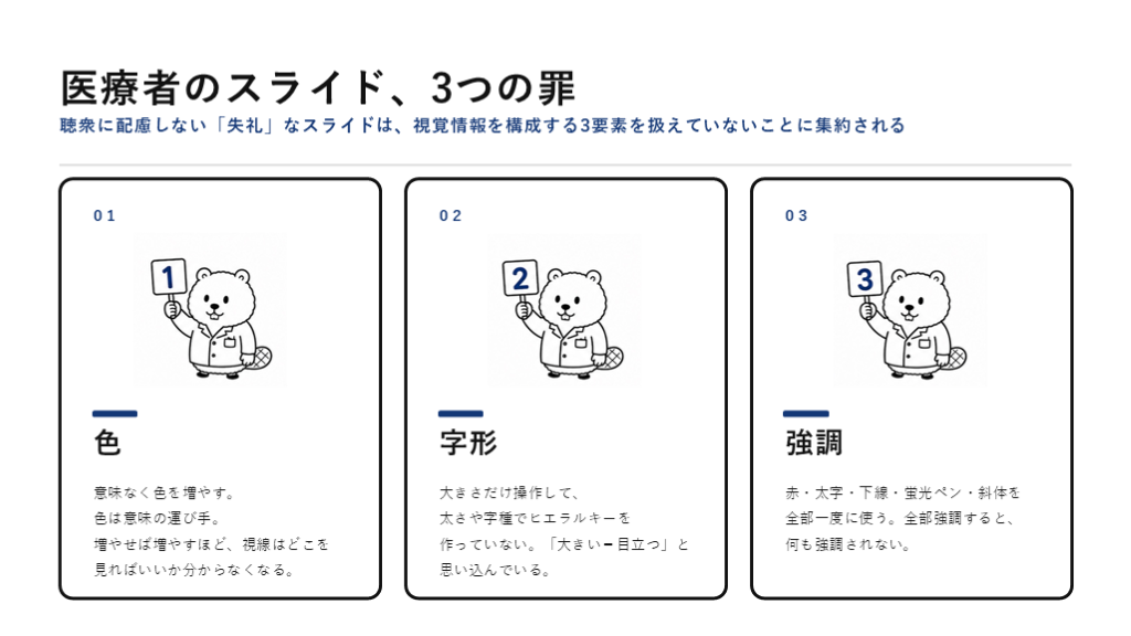 #8. 医療者のスライド、3つの罪 聴衆に配慮しない「失礼」なスライドは、視覚情報を構成する3要素を扱えていないことに集約される 01 色 意味なく色を増やす。色は意味の運び手。増やせば増やすほど、視線はどこを見ればいいか分からなくなる。 02 字形 大きさだけ操作して、太さや字種でヒエラルキーを作っていない。「大きい=目立つ」と思い込んでいる。 03 強調 赤・太字・下線・蛍光ペン・斜体を全部一度に使う。全部強調すると、何も強調されない。