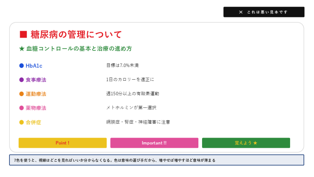#9. ■ 糖尿病の管理について ★ 血糖コントロールの基本と治療の進め方 ● HbA1c 目標は7.0%未満 ● 食事療法 1日のカロリーを適正に ● 運動療法 週150分以上の有酸素運動 ● 薬物療法 メトホルミンが第一選択 ● 合併症 網膜症・腎症・神経障害に注意 Point ! Important !! 覚えよう ★ ✕ これは悪い見本です 7色を使うと、視線はどこを見ればいいか分からなくなる。色は意味の運び手だから、増やせば増やすほど意味が薄まる