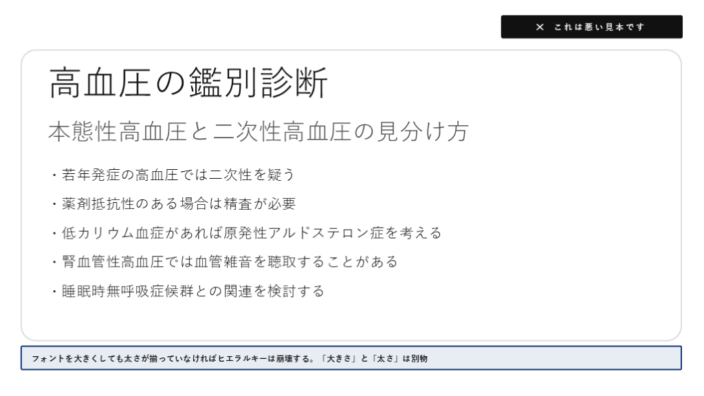 #10. 高血圧の鑑別診断 本態性高血圧と二次性高血圧の見分け方 ・若年発症の高血圧では二次性を疑う ・薬剤抵抗性のある場合は精査が必要 ・低カリウム血症があれば原発性アルドステロン症を考える ・腎血管性高血圧では血管雑音を聴取することがある ・睡眠時無呼吸症候群との関連を検討する ✕ これは悪い見本です フォントを大きくしても太さが揃っていなければヒエラルキーは崩壊する。「大きさ」と「太さ」は別物