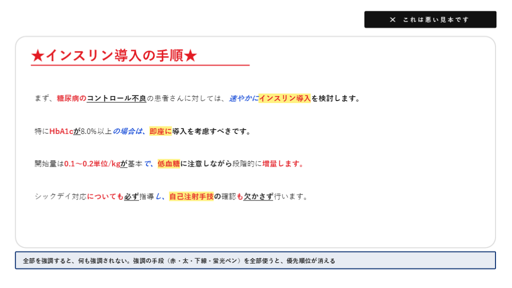 #11. ★インスリン導入の手順★ まず、糖尿病のコントロール不良の患者さんに対しては、速やかにインスリン導入を検討します。 特にHbA1cが8.0%以上の場合は、即座に導入を考慮すべきです。 開始量は0.1〜0.2単位/kgが基本で、低血糖に注意しながら段階的に増量します。 シックデイ対応についても必ず指導し、自己注射手技の確認も欠かさず行います。 ✕ これは悪い見本です 全部を強調すると、何も強調されない。強調の手段(赤・太・下線・蛍光ペン)を全部使うと、優先順位が消える