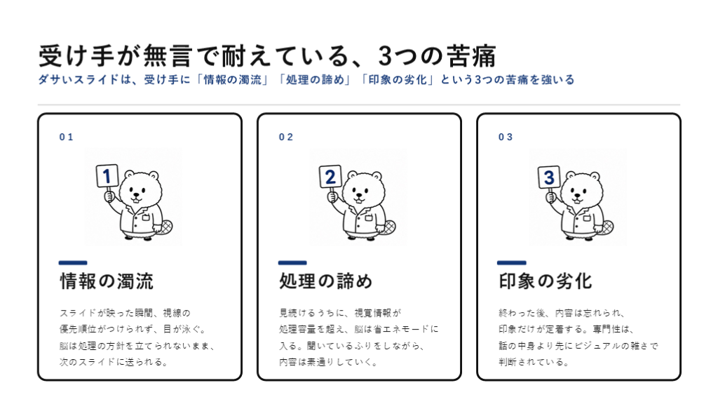 #12. 受け手が無言で耐えている、3つの苦痛 ダサいスライドは、受け手に「情報の濁流」「処理の諦め」「印象の劣化」という3つの苦痛を強いる 01 情報の濁流 スライドが映った瞬間、視線の優先順位がつけられず、目が泳ぐ。脳は処理の方針を立てられないまま、次のスライドに送られる。 02 処理の諦め 見続けるうちに、視覚情報が処理容量を超え、脳は省エネモードに入る。聞いているふりをしながら、内容は素通りしていく。 03 印象の劣化 終わった後、内容は忘れられ、印象だけが定着する。専門性は、話の中身より先にビジュアルの雑さで判断されている。