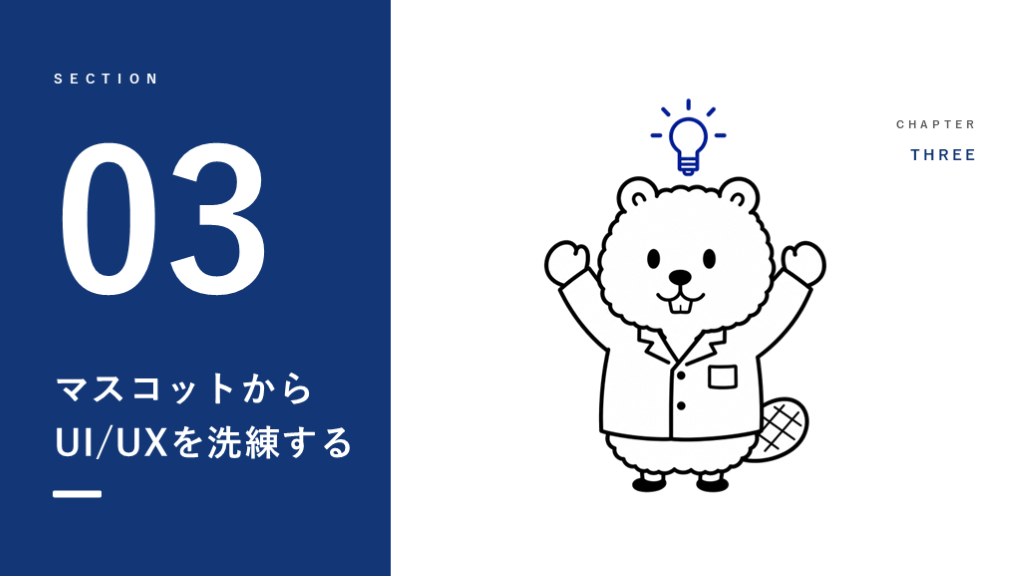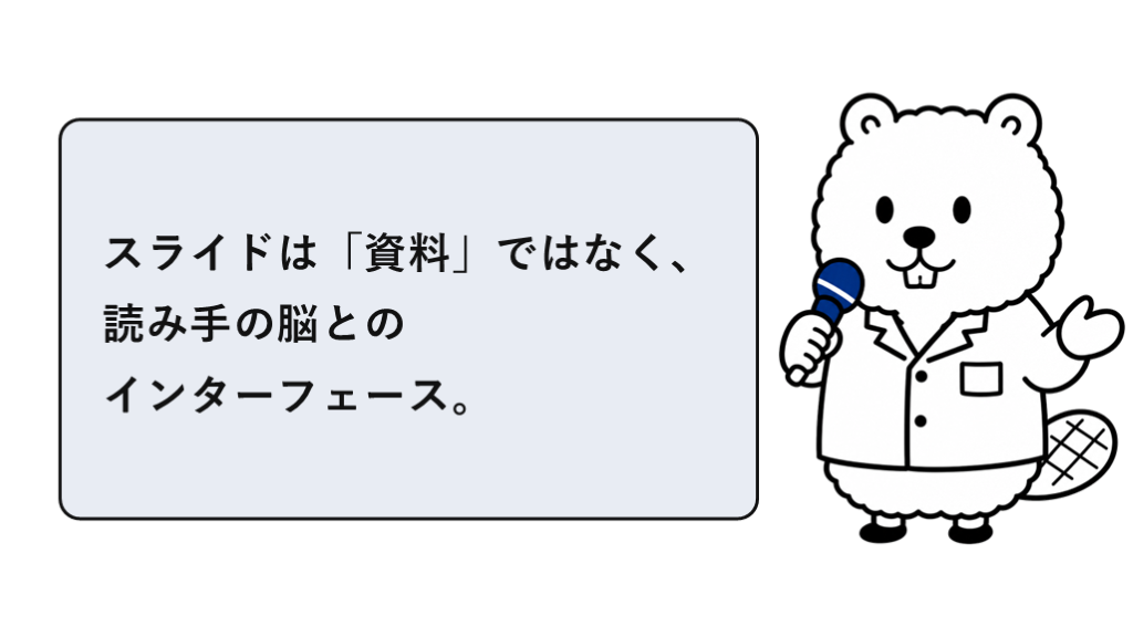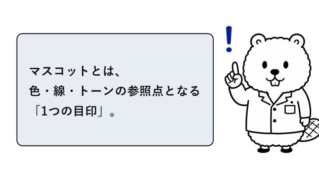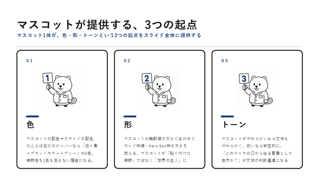 #24. マスコットが提供する、3つの起点 マスコット1体が、色・形・トーンという3つの起点をスライド全体に提供する 01 色 マスコットの配色=スライドの配色。たとえば白衣のビーバーなら「白+黒+ブランドカラー+グレー」の4色。装飾色を1色も足さない理由になる。 02 形 マスコットの輪郭線の太さに合わせてカード枠線・hero box枠の太さを揃える。マスコットが「貼り付けた装飾」ではなく「世界の住人」に 03 トーン マスコットがやわらかいなら文体もやわらかく、鋭いなら断定的に。「このキャラの口から出る言葉として自然か?」が文体の判断基準になる