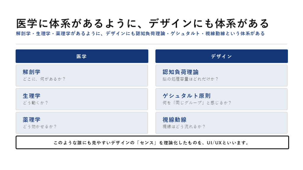 #16. 医学に体系があるように、デザインにも体系がある 解剖学・生理学・薬理学があるように、デザインにも認知負荷理論・ゲシュタルト・視線動線という体系がある 医学 デザイン 解剖学 どこに、何があるか? 認知負荷理論 脳の処理容量はどれだけか? 生理学 どう動くか? ゲシュタルト原則 何を「同じグループ」と感じるか? 薬理学 どう効かせるか? 視線動線 視線はどう流れるか? このような誰にも見やすいデザインの「センス」を理論化したものを、UI/UXといいます。