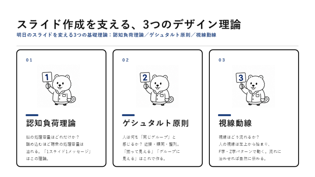 #17. スライド作成を支える、3つのデザイン理論 明日のスライドを変える3つの基礎理論:認知負荷理論/ゲシュタルト原則/視線動線 01 認知負荷理論 脳の処理容量はどれだけか? 詰め込むほど聴衆の処理容量は溢れる。「1スライド1メッセージ」はこの理論。 02 ゲシュタルト原則 人は何を「同じグループ」と感じるか? 近接・類同・整列。「揃って見える」「グループに見える」はこれで作る。 03 視線動線 視線はどう流れるか? 人の視線は左上から始まり、F字・Z字パターンで動く。流れに沿わせれば自然に伝わる。