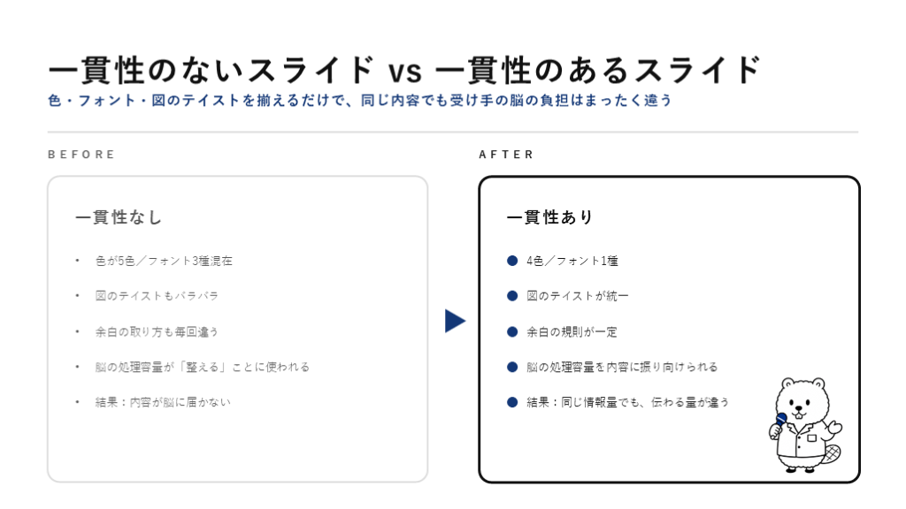 #18. 一貫性のないスライド vs 一貫性のあるスライド 色・フォント・図のテイストを揃えるだけで、同じ内容でも受け手の脳の負担はまったく違う BEFORE 一貫性なし • 色が5色/フォント3種混在 • 図のテイストもバラバラ • 余白の取り方も毎回違う • 脳の処理容量が「整える」ことに使われる • 結果:内容が脳に届かない ▶ AFTER 一貫性あり ● 4色/フォント1種 ● 図のテイストが統一 ● 余白の規則が一定 ● 脳の処理容量を内容に振り向けられる ● 結果:同じ情報量でも、伝わる量が違う