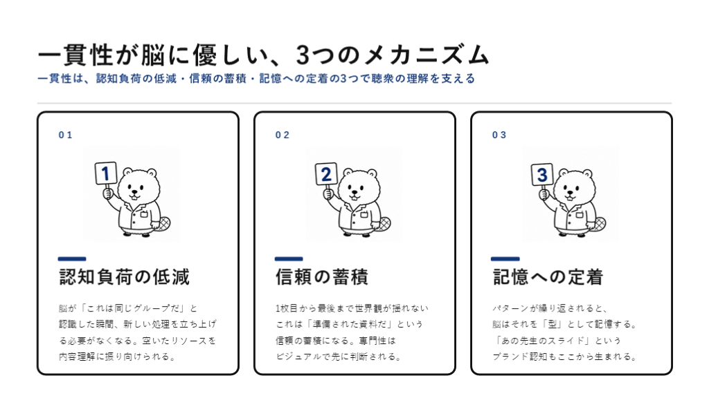 #19. 一貫性が脳に優しい、3つのメカニズム 一貫性は、認知負荷の低減・信頼の蓄積・記憶への定着の3つで聴衆の理解を支える 01 認知負荷の低減 脳が「これは同じグループだ」と認識した瞬間、新しい処理を立ち上げる必要がなくなる。空いたリソースを内容理解に振り向けられる。 02 信頼の蓄積 1枚目から最後まで世界観が揺れないこれは「準備された資料だ」という信頼の蓄積になる。専門性はビジュアルで先に判断される。 03 記憶への定着 パターンが繰り返されると、脳はそれを「型」として記憶する。「あの先生のスライド」というブランド認知もここから生まれる。