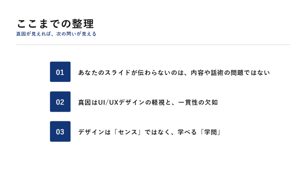 #20. ここまでの整理 真因が見えれば、次の問いが見える 01 あなたのスライドが伝わらないのは、内容や話術の問題ではない 02 真因はUI/UXデザインの軽視と、一貫性の欠如 03 デザインは「センス」ではなく、学べる「学問」