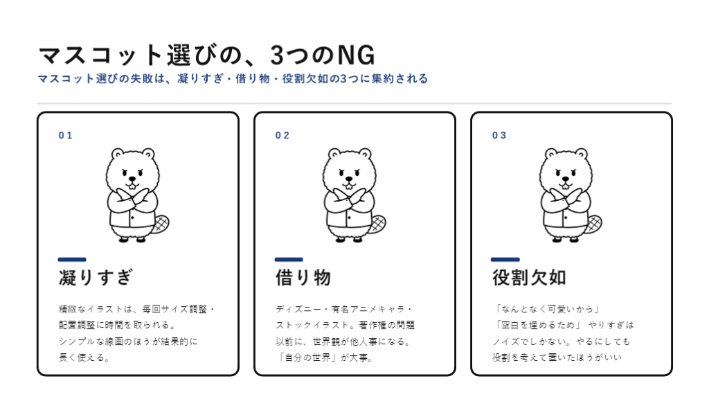 #25. マスコット選びの、3つのNG マスコット選びの失敗は、凝りすぎ・借り物・役割欠如の3つに集約される 01 凝りすぎ 精緻なイラストは、毎回サイズ調整・配置調整に時間を取られる。シンプルな線画のほうが結果的に長く使える。 02 借り物 ディズニー・有名アニメキャラ・ストックイラスト。著作権の問題以前に、世界観が他人事になる。「自分の世界」が大事。 03 役割欠如 「なんとなく可愛いから」「空白を埋めるため」 やりすぎはノイズでしかない。やるにしても