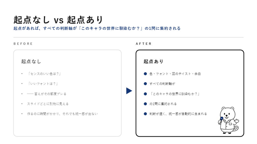 #26. 起点なし vs 起点あり 起点があれば、すべての判断軸が「このキャラの世界に馴染むか?」の1問に集約される BEFORE 起点なし • 「センスのいい色は?」 • 「いいフォントは?」 • ── 答えがその都度ブレる • スライドごとに別物に見える • 作るのに時間がかかり、それでも統一感が出ない ▶ AFTER 起点あり ● 色・フォント・図のテイスト・余白 ● すべての判断軸が ● 「このキャラの世界に馴染むか?」 ● の1問に集約される ● 判断が速く、統一感が自動的に生まれる