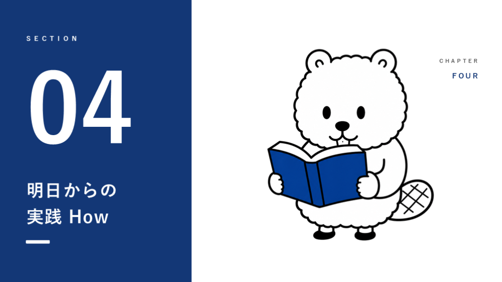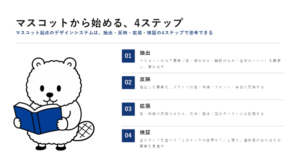 #27. マスコットから始める、4ステップ マスコット起点のデザインシステムは、抽出・反映・拡張・検証の4ステップで思考できる 01 抽出 マスコットのコア要素(色・線の太さ・輪郭の丸み・全体のトーン)を観察し、書き出す 02 反映 抽出した要素を、スライドの色・枠線・フォント・余白に反映する 03 拡張 色・枠線で反映できたら、文体・話法・図のテイストにも拡張する 04 検証 全スライドを並べて「このキャラの世界か?」と問う。違和感があればその要素を見直す