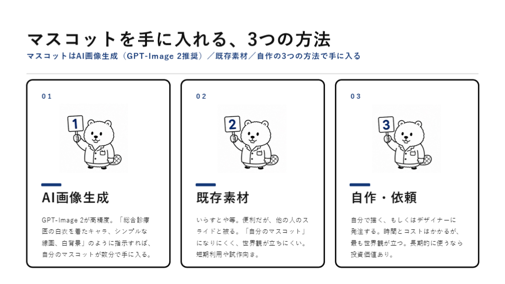 #29. マスコットを手に入れる、3つの方法 マスコットはAI画像生成(GPT-Image 2推奨)/既存素材/自作の3つの方法で手に入る 01 AI画像生成 GPT-Image 2が高精度。「総合診療医の白衣を着たキャラ、シンプルな線画、白背景」のように指示すれば、自分のマスコットが数分で手に入る。 02 既存素材 いらすとや等。便利だが、他の人のスライドと被る。「自分のマスコット」になりにくく、世界観が立ちにくい。短期利用や試作向き。 03 自作・依頼 自分で描く、もしくはデザイナーに発注する。時間とコストはかかるが、最も世界観が立つ。長期的に使うなら投資価値あり。