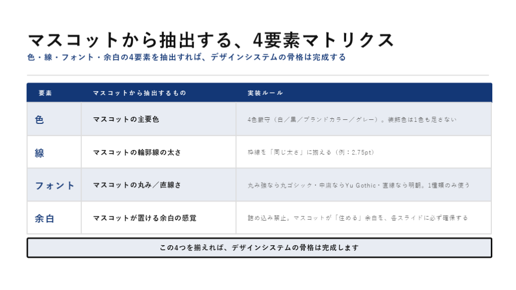 #30. マスコットから抽出する、4要素マトリクス 色・線・フォント・余白の4要素を抽出すれば、デザインシステムの骨格は完成する 要素 マスコットから抽出するもの 実装ルール 色 マスコットの主要色 4色厳守(白/黒/ブランドカラー/グレー)。装飾色は1色も足さない 線 マスコットの輪郭線の太さ 枠線を「同じ太さ」に揃える(例:2.75pt) フォント マスコットの丸み/直線さ 丸み強なら丸ゴシック・中庸ならYu Gothic・直線なら明朝。1種類のみ使う 余白 マスコットが置ける余白の感覚 詰め込み禁止。マスコットが「住める」余白を、各スライドに必ず確保する この4つを揃えれば、デザインシステムの骨格は完成します