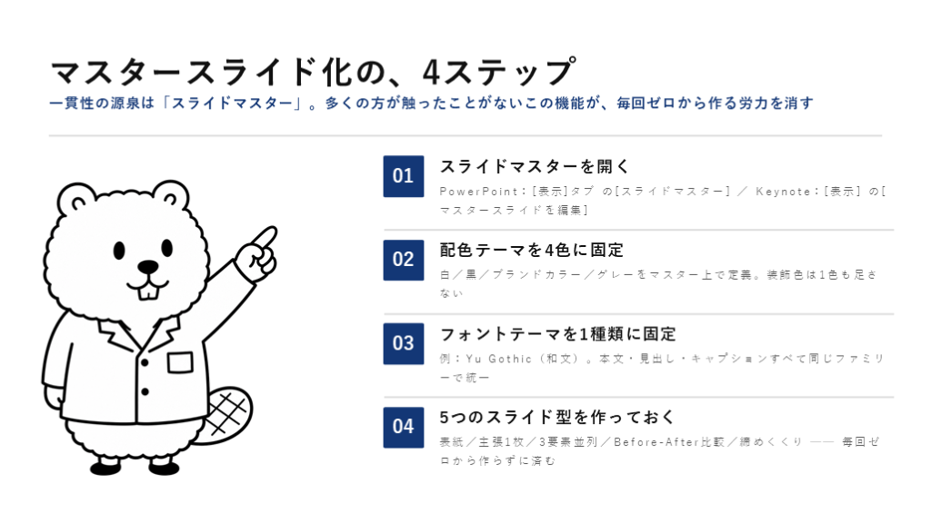 #31. マスタースライド化の、4ステップ 一貫性の源泉は「スライドマスター」。多くの方が触ったことがないこの機能が、毎回ゼロから作る労力を消す 01 スライドマスターを開く PowerPoint:[表示]タブ の[スライドマスター] / Keynote:[表示] の[マスタースライドを編集] 02 配色テーマを4色に固定 白/黒/ブランドカラー/グレーをマスター上で定義。装飾色は1色も足さない 03 フォントテーマを1種類に固定 例:Yu Gothic(和文)。本文・見出し・キャプションすべて同じファミリーで統一 04 5つのスライド型を作っておく 表紙/主張1枚/3要素並列/Before-After比較/締めくくり ── 毎回ゼロから作らずに済む