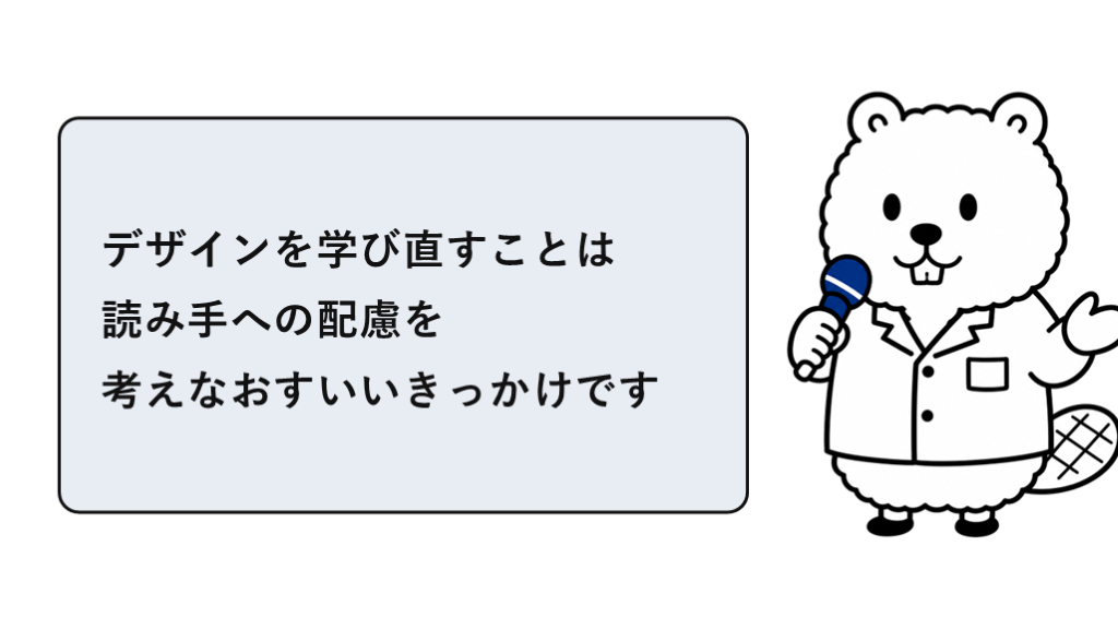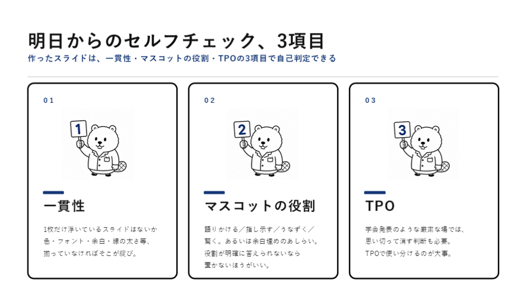 #32. 明日からのセルフチェック、3項目 作ったスライドは、一貫性・マスコットの役割・TPOの3項目で自己判定できる 01 一貫性 1枚だけ浮いているスライドはないか色・フォント・余白・線の太さ等、揃っていなければそこが綻び。 02 マスコットの役割 語りかける/指し示す/うなずく/驚く。あるいは余白埋めのあしらい。役割が明確に答えられないなら置かないほうがいい。 03 TPO 学会発表のような厳粛な場では、思い切って消す判断も必要。TPOで使い分けるのが大事。