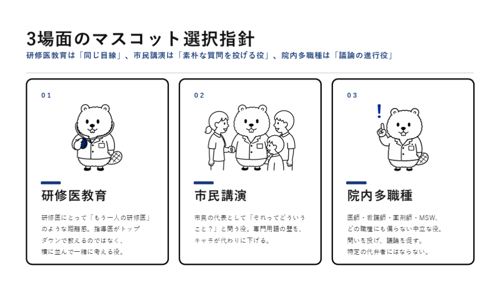 #34. 3場面のマスコット選択指針 研修医教育は「同じ目線」、市民講演は「素朴な質問を投げる役」、院内多職種は「議論の進行役」 01 研修医教育 研修医にとって「もう一人の研修医」のような距離感。指導医がトップダウンで教えるのではなく、横に並んで一緒に考える役。 02 市民講演 市民の代表として「それってどういうこと?」と問う役。専門用語の壁を、キャラが代わりに下げる。 03 院内多職種 医師・看護師・薬剤師・MSW、どの職種にも偏らない中立な役。問いを投げ、議論を促す。特定の代弁者にはならない。