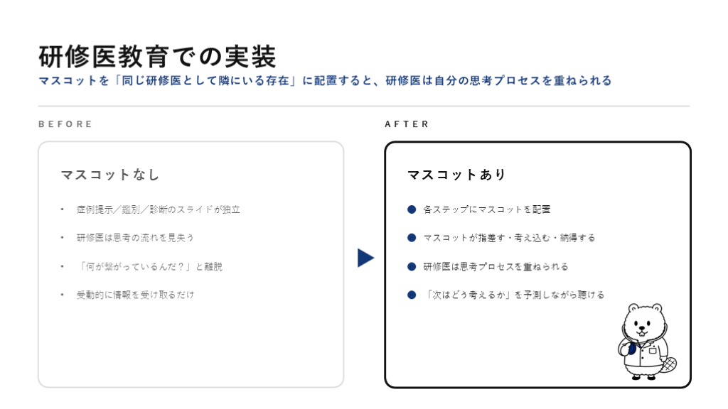 #35. 研修医教育での実装 マスコットを「同じ研修医として隣にいる存在」に配置すると、研修医は自分の思考プロセスを重ねられる BEFORE マスコットなし • 症例提示/鑑別/診断のスライドが独立 • 研修医は思考の流れを見失う • 「何が繋がっているんだ?」と離脱 • 受動的に情報を受け取るだけ ▶ AFTER マスコットあり ● 各ステップにマスコットを配置 ● マスコットが指差す・考え込む・納得する ● 研修医は思考プロセスを重ねられる ● 「次はどう考えるか」を予測しながら聴ける