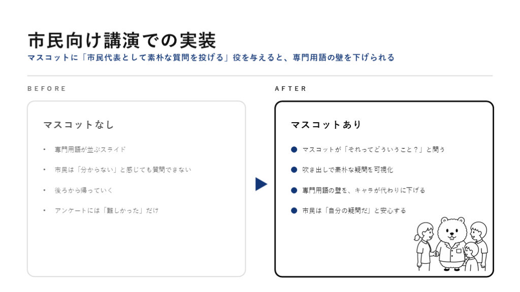 #36. 市民向け講演での実装 マスコットに「市民代表として素朴な質問を投げる」役を与えると、専門用語の壁を下げられる BEFORE マスコットなし • 専門用語が並ぶスライド • 市民は「分からない」と感じても質問できない • 後ろから帰っていく • アンケートには「難しかった」だけ ▶ AFTER マスコットあり ● マスコットが「それってどういうこと?」と問う ● 吹き出しで素朴な疑問を可視化 ● 専門用語の壁を、キャラが代わりに下げる ● 市民は「自分の疑問だ」と安心する