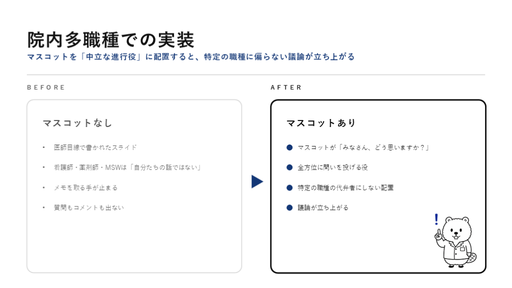 #37. 院内多職種での実装 マスコットを「中立な進行役」に配置すると、特定の職種に偏らない議論が立ち上がる BEFORE マスコットなし • 医師目線で書かれたスライド • 看護師・薬剤師・MSWは「自分たちの話ではない」 • メモを取る手が止まる • 質問もコメントも出ない ▶ AFTER マスコットあり ● マスコットが「みなさん、どう思いますか?」 ● 全方位に問いを投げる役 ● 特定の職種の代弁者にしない配置 ● 議論が立ち上がる