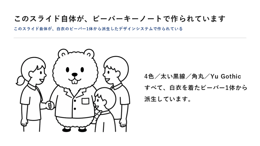 #39. このスライド自体が、ビーバーキーノートで作られています このスライド自体が、白衣のビーバー1体から派生したデザインシステムで作られている 4色/太い黒線/角丸/Yu Gothic