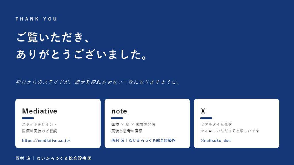 ありがとうございました。 明日からのスライドが、聴衆を疲れさせない一枚になりますように。 Mediative スライドデザイン・