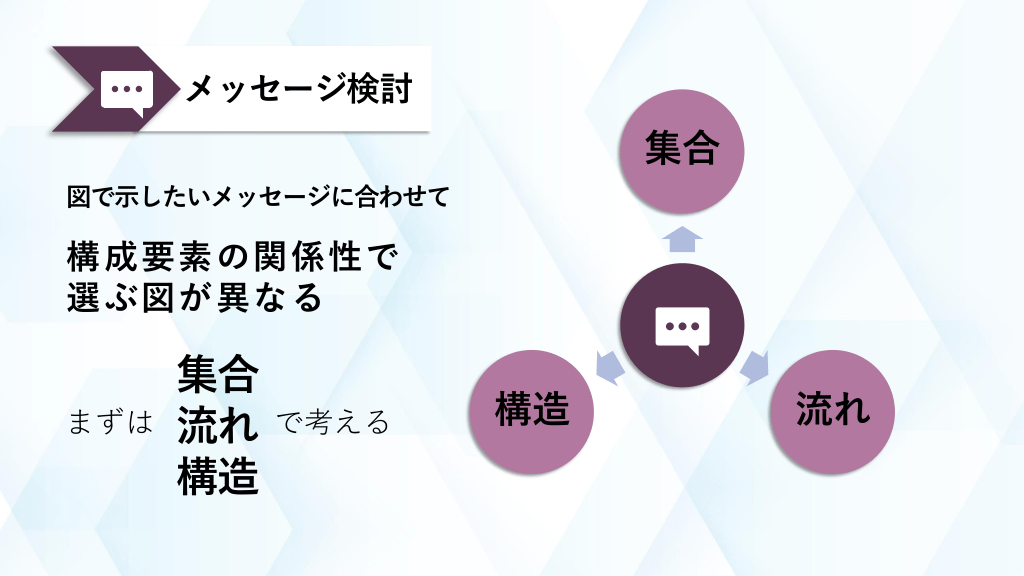 #2. メッセージ検討 集合 図で示したいメッセージに合わせて 構成要素の関係性で 選ぶ図が異なる まずは 集合 流れ 構造 で考える 構造 流れ