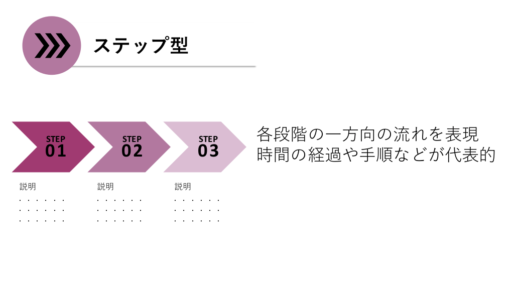#4. ステップ型 STEP 01 説明 ...... ...... ...... STEP 02 説明 ...... ...... ...... STEP 03 説明 ...... ...... ...... 各段階の一方向の流れを表現 時間の経過や手順などが代表的