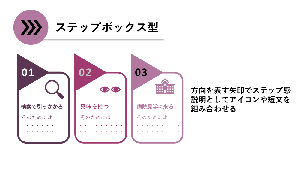 #6. ステップボックス型 01 02 03 検索で引っかかる 興味を持つ 病院見学に来る そのためには ......... ......... そのためには ......... ......... そのためには ......... ......... 方向を表す矢印でステップ感 説明としてアイコンや短文を 組み合わせる