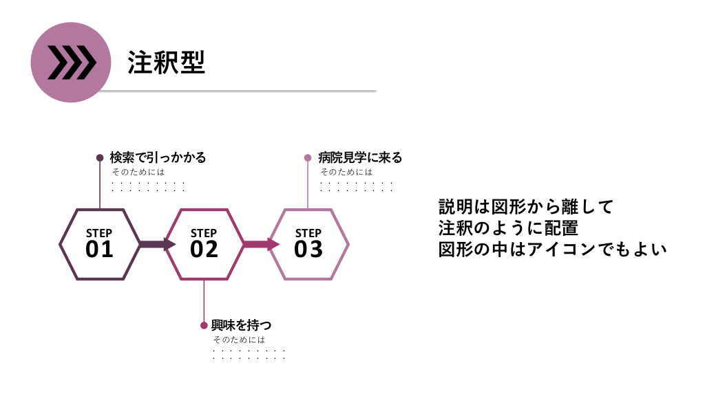 #7. 注釈型 検索で引っかかる 病院見学に来る そのためには ......... ......... そのためには ......... ......... STEP 01 STEP 02 興味を持つ そのためには ......... ......... STEP 03 説明は図形から離して 注釈のように配置 図形の中はアイコンでもよい