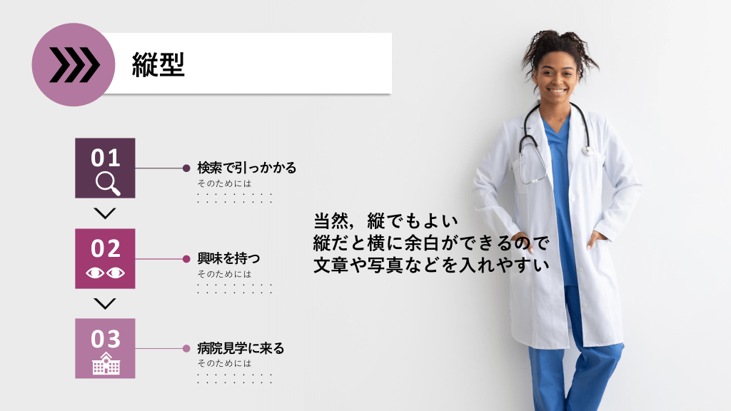 #8. 縦型 01 検索で引っかかる そのためには ......... ......... 02 興味を持つ そのためには ......... ......... 03 病院見学に来る そのためには ......... ......... 当然,縦でもよい 縦だと横に余白ができるので 文章や写真などを入れやすい