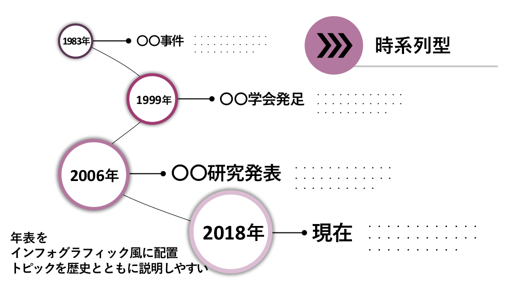 #9. 1983年 〇〇事件 ・・・・・・・・・・・・ ・・・・・・・・・・・・ ・・・・・・・・・・ 〇〇学会発足 1999年 2006年 時系列型 〇〇研究発表 2018年 年表を インフォグラフィック風に配置 トピックを歴史とともに説明しやすい ・・・・・・・・・・・・ ・・・・・・・・・・・・ ・・・・・・・・・・ ・・・・・・・・・・・・ ・・・・・・・・・・・・ ・・・・・・・・・・ 現在 ・・・・・・・・・・・・ ・・・・・・・・・・・・ ・・・・・・・・・・