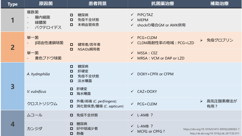 #1. LRINEC score 皮膚・皮下組織の N Engl J Med 2017;377:2253-65. 内科緊急疾患 壊死性 軟部組織 感染症 のマネジメント 臨床所見・患者背景 CRP 特に重要な徴候として 発赤 腫脹 ① 局所所見に比べて痛みが異常に強い ② 皮膚が湿潤している ③ 進行が早い 非壊死性軟部組織感染症との鑑別点 頻脈 (HR>120) 低血圧 CK高値 CRP>15 LRINEC score>6 疼痛 原因菌 貫通性の外傷 C. perfringens, C. histolyticum, C. novyi 海水と接触 V. vulnificus 淡水と接触 A. hydrophila 陰部から波及 腸内細菌±嫌気性菌 非貫通性の外傷・微小な傷 S. pyogenes 糖尿病 腸内細菌±嫌気性菌 肝硬変 V. vulnificus, 大腸菌 好中球減少/大腸腫瘍 C. septicum 画像上ガス産生を示唆する所見がなくても 否定しない・否定できない 治 療 デブリドマン 原因菌に応じた 抗菌薬 WBC Hb Na Cr 血糖 <15 0 ≧15 4 <15000 0 15000-25000 1 >25000 2 >13.5 0 11-13.5 1 <11 2 ≧135 0 <135 2 ≦1.6 0 >1.6 2 ≦180 0 >180 1 壊死性 軟部組織 感染症 として対応