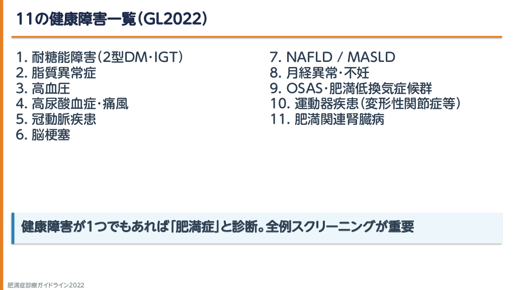 #10. 11の健康障害一覧(GL2022) 1. 2. 3. 4. 5. 6. 耐糖能障害(2型DM・IGT) 脂質異常症 高血圧 高尿酸血症・痛風 冠動脈疾患 脳梗塞 7. NAFLD / MASLD 8. 月経異常・不妊 9. OSAS・肥満低換気症候群 10. 運動器疾患(変形性関節症等) 11. 肥満関連腎臓病 健康障害が1つでもあれば「肥満症」と診断。全例スクリーニングが重要 肥満症診療ガイドライン2022