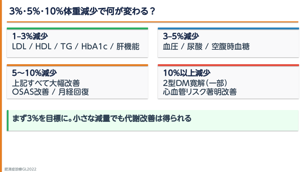 #11. 3%・5%・10%体重減少で何が変わる? 1–3%減少 LDL / HDL / TG / HbA1c / 肝機能 3–5%減少 血圧 / 尿酸 / 空腹時血糖 5〜10%減少 上記すべて大幅改善 OSAS改善 / 月経回復 10%以上減少 2型DM寛解(一部) 心血管リスク著明改善 まず3%を目標に。小さな減量でも代謝改善は得られる 肥満症診療GL2022