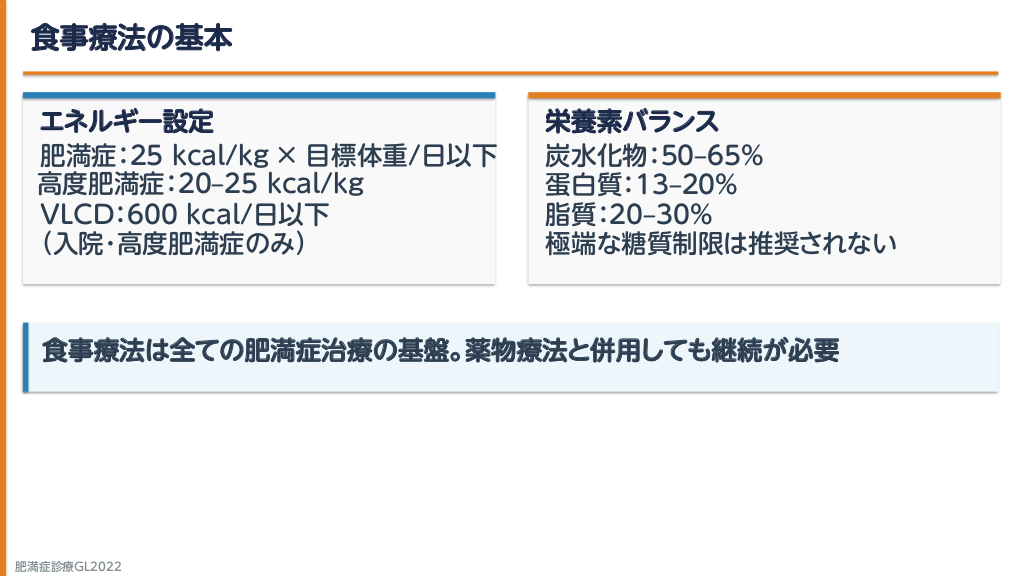#13. 食事療法の基本 エネルギー設定 肥満症:25 kcal/kg × 目標体重/日以下 高度肥満症:20–25 kcal/kg VLCD:600 kcal/日以下 (入院・高度肥満症のみ) 栄養素バランス 炭水化物:50–65% 蛋白質:13–20% 脂質:20–30% 極端な糖質制限は推奨されない 食事療法は全ての肥満症治療の基盤。薬物療法と併用しても継続が必要 肥満症診療GL2022