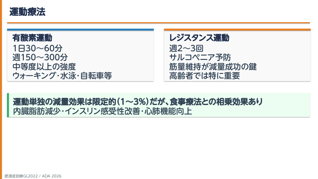 #14. 運動療法 有酸素運動 1日30〜60分 週150〜300分 中等度以上の強度 ウォーキング・水泳・自転車等 レジスタンス運動 週2〜3回 サルコペニア予防 筋量維持が減量成功の鍵 高齢者では特に重要 運動単独の減量効果は限定的(1〜3%)だが、食事療法との相乗効果あり 内臓脂肪減少・インスリン感受性改善・心肺機能向上 肥満症診療GL2022 / ADA 2026