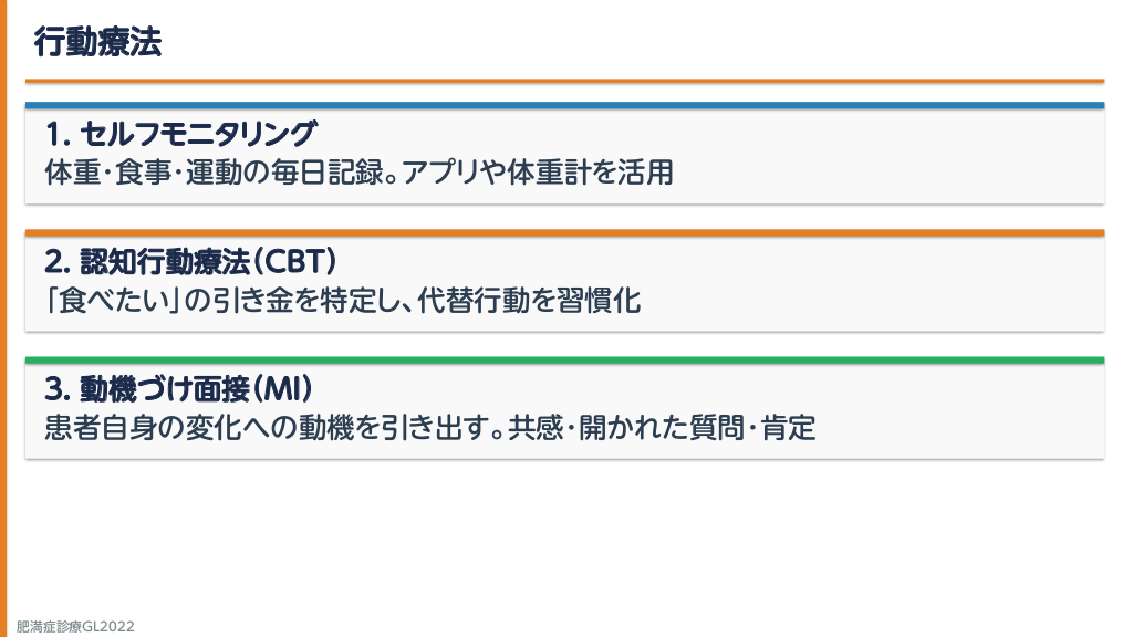 #15. 行動療法 1. セルフモニタリング 体重・食事・運動の毎日記録。アプリや体重計を活用 2. 認知行動療法(CBT) 「食べたい」の引き金を特定し、代替行動を習慣化 3. 動機づけ面接(MI) 患者自身の変化への動機を引き出す。共感・開かれた質問・肯定 肥満症診療GL2022