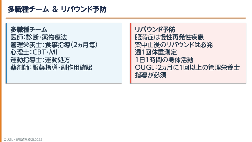 #16. 多職種チーム & リバウンド予防 多職種チーム 医師:診断・薬物療法 管理栄養士:食事指導(2ヵ月毎) 心理士:CBT・MI 運動指導士:運動処方 薬剤師:服薬指導・副作用確認 OUGL / 肥満症診療GL2022 リバウンド予防 肥満症は慢性再発性疾患 薬中止後のリバウンドは必発 週1回体重測定 1日1時間の身体活動 OUGL:2ヵ月に1回以上の管理栄養士 指導が必須