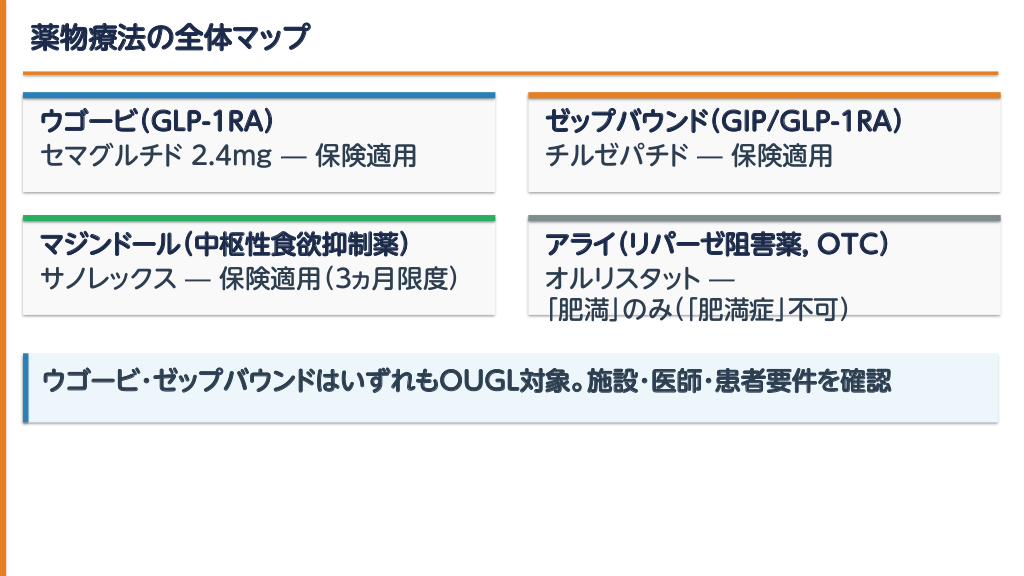 #18. 薬物療法の全体マップ ウゴービ(GLP-1RA) セマグルチド 2.4mg — 保険適用 ゼップバウンド(GIP/GLP-1RA) チルゼパチド — 保険適用 マジンドール(中枢性食欲抑制薬) サノレックス — 保険適用(3ヵ月限度) アライ(リパーゼ阻害薬, OTC) オルリスタット — 「肥満」のみ(「肥満症」不可) ウゴービ・ゼップバウンドはいずれもOUGL対象。施設・医師・患者要件を確認