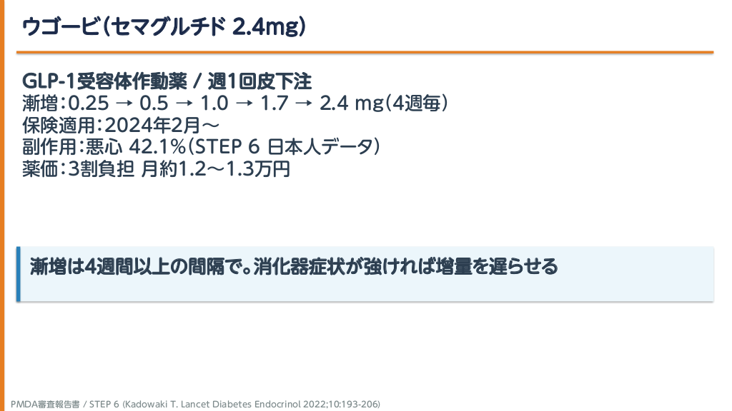 #19. ウゴービ(セマグルチド 2.4mg) GLP-1受容体作動薬 / 週1回皮下注 漸増:0.25 → 0.5 → 1.0 → 1.7 → 2.4 mg(4週毎) 保険適用:2024年2月~ 副作用:悪心 42.1%(STEP 6 日本人データ) 薬価:3割負担 月約1.2〜1.3万円 漸増は4週間以上の間隔で。消化器症状が強ければ增量を遅らせる PMDA審査報告書 / STEP 6 (Kadowaki T. Lancet Diabetes Endocrinol 2022;10:193-206)